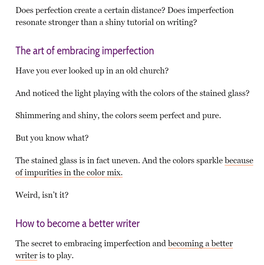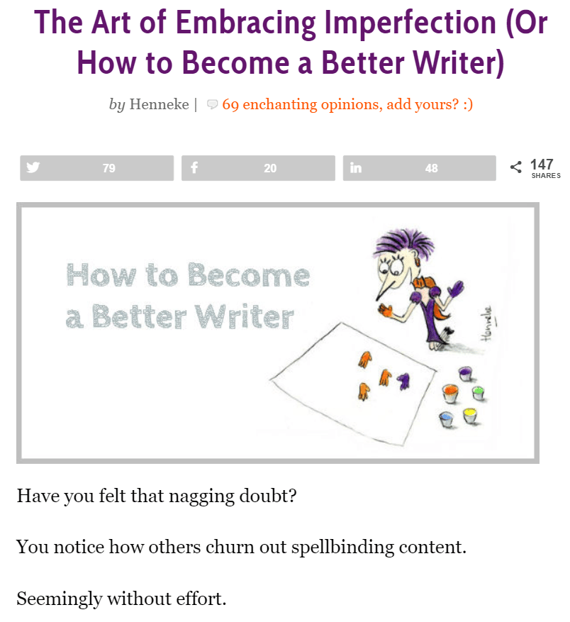 Another example from another great copywriter, Henneke Duistermaat of Enchanting Marketing, is this blog post on banishing perfectionism: