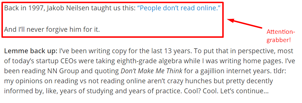 That element of surprise (her against-the-grain opinion about online readers) hooks us and makes us commit to reading more. We want to know why she’ll never forgive Jakob Nielsen (of the Nielsen Norman Group).
