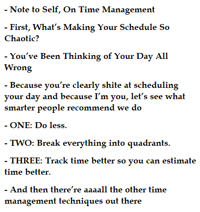 • Tell a story with your subheadings (connect them to each other). Let’s look at another post by Joanna Wiebe for a good example. In this post on time management, she uses the subheadings to both describe each section of the article as well as tell a story (structured like she’s talking it out with herself). I’ve compiled them so you can see the whole picture: