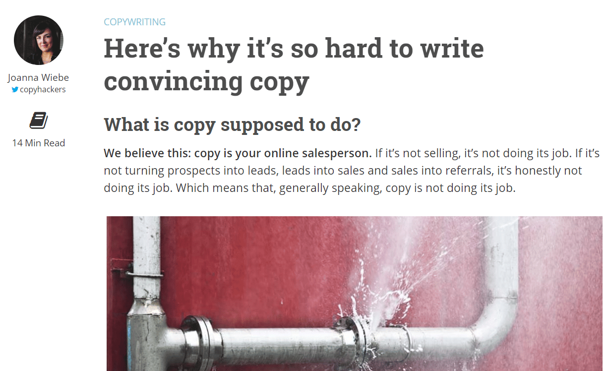 Joanna Wiebe of Copy Hackers is especially good at doing this. Look at this blog post she wrote called “Here’s why it’s so hard to write convincing copy”: