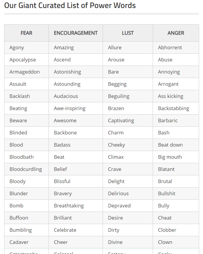 (Need examples? This post by Jon Morrow is the original guide to power words.)