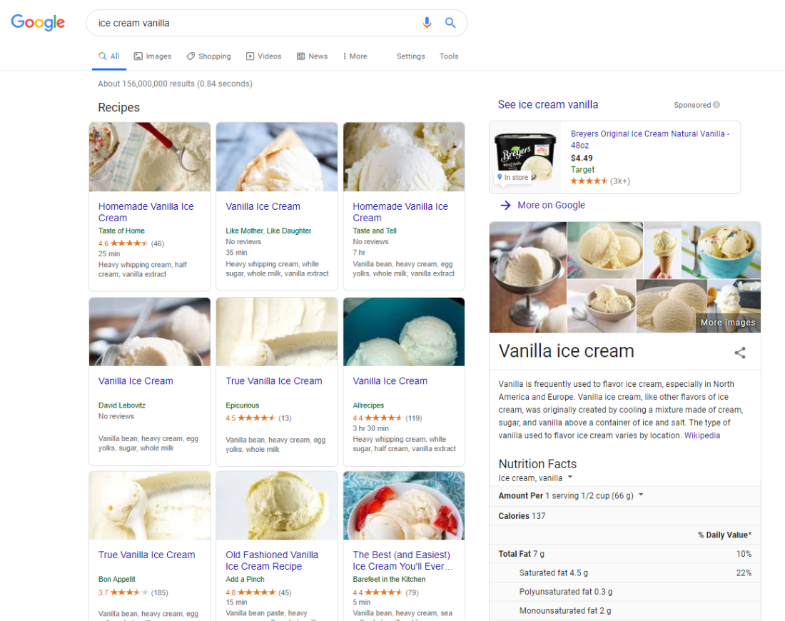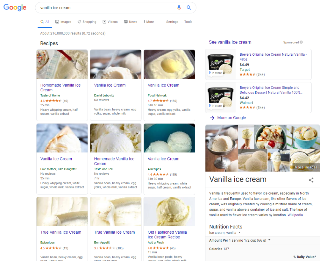 Example: The SERPs for the keywords “vanilla ice cream” and “ice cream vanilla” have identical results displayed in different orders. (Both recipe lists include Taste of Home, Epicurious, David Lebovitz, Taste and Tell, Like Mother Like Daughter, and Allrecipes.)