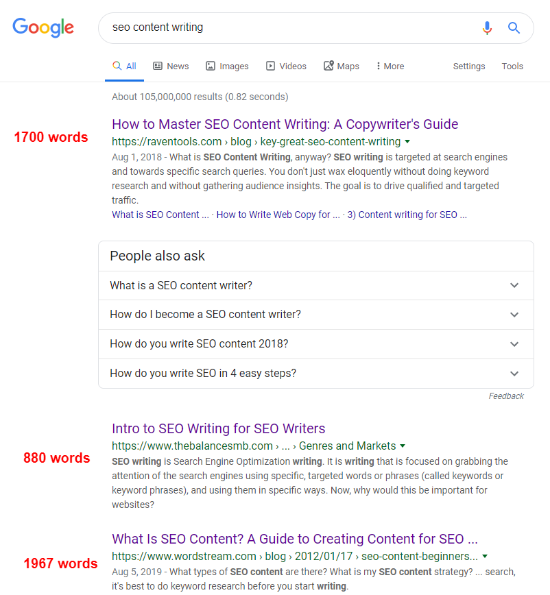 For the keyword “SEO content writing,” the top 3 results have an average word count of 1,515. The lowest is 880, the highest 1,967.