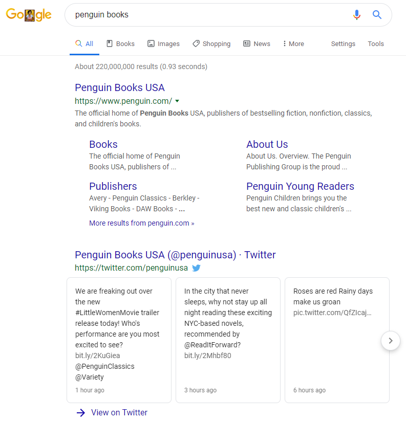 For instance, search for any entity on Google (person, company, organization), and you’ll see results displayed from their Twitter feed: