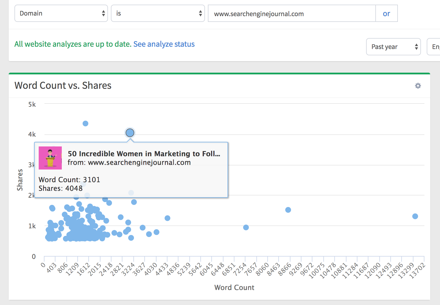 A search in Hawkeye’s Analyze section on the topic “content marketing” reveals only ONE article that’s achieved more than 20,000 shares.