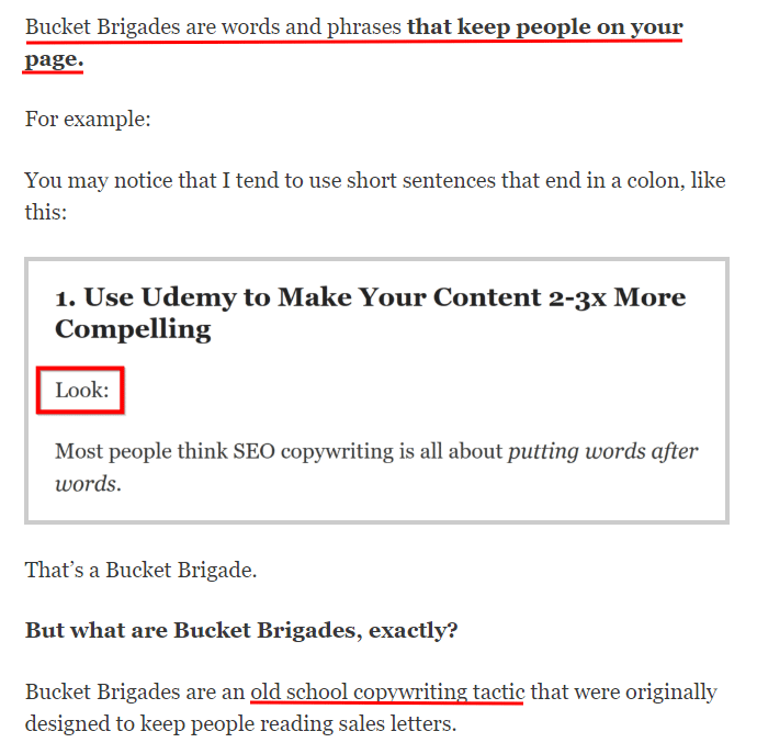 For example, use one-line paragraphs to pull your readers’ eyes down the page. These are called “bucket brigades” (Brian Dean explains them really well in his SEO copywriting article).