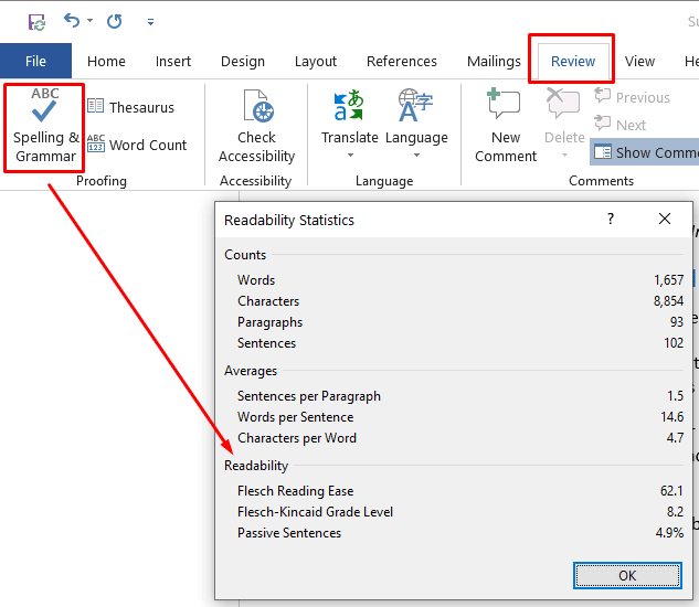 - Microsoft Word has a reading score tool built in. To use it, just go to Review >> Spelling & Grammar. Go through the spell-check. When it’s finished, the final screen will display lots of extra information about your text, including the various readability scores.