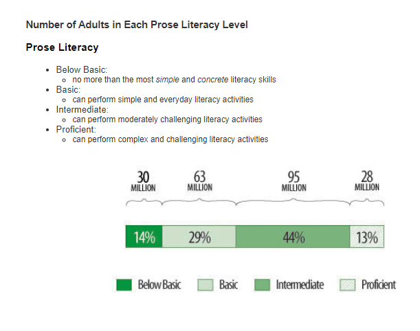 According to a rigorous literacy study, the National Assessment of Adult Literacy (NAAL) published by the National Center for Education Statistics, the average prose adult literacy level is basic to intermediate.