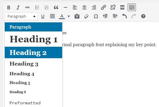 Don’t forget to tag your headings appropriately and make them stand out from the body text. In WordPress, there’s a dropdown menu that lets you apply headings to text, including formatting: