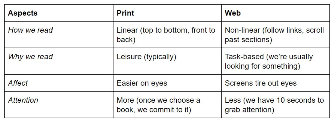 People read and interact with electronic text differently than they do with printed text. This table from Writing Cooperative shows what I mean: